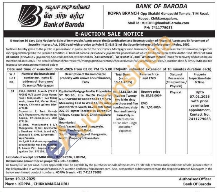 Equitable Mortgage land in Property in SY NO:65, Site No:26 Property No:150900301800220432/1526 Measuring East to West 12.192 mtrs and North to South 18.288 mtr total 222.96 sqmtr located in harandur Village, Koppa Taluk, Chickmagaluru Dist. Boundaries: East: Vacant place of thangavelu. West: Panchayath Road. South: Vacant place of thangavelu. North: Property of Haneefabi