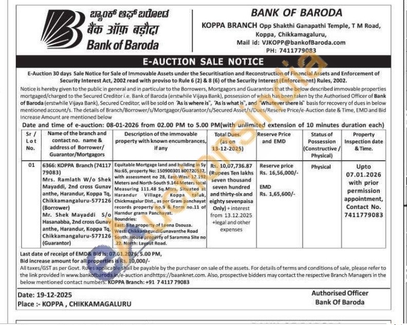 Equitable Mortgage land and building in Sy No:65, property No: 150900301 800220532, with assessment no 28, East-West 12.192 Meters and North-South 9.144 Meters total Measuring 111.48 Sq.Mtrs, Situated at Harandur Village, Koppa taluk, Chickmagalur Dist., as per Gram panchayat records property no.9 & Form no.11 of Harndur grama Panchayat East: Site property of Leena Dsouza. West: ChikkanagundiGunavanthe Road South: House property of Saramma Site no 22. North: Layout Road