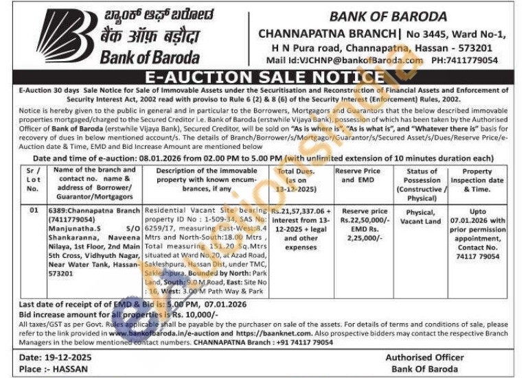 Residential Vacant Site bearing property ID No: 1-509-34, SAS No: 6259/17, measuring East-West:8.4 Mtrs and North-South:18.00 Mtrs, Total measuring 151.20 Sq.Mtrs situated at Ward No.20, at Azad Road, Sakleshpura, Hassan Dist, under TMC, Sakleshpura, Bounded by North: Park Land, South: 9.0 M Road, East: Site No 16, West: 3.00 M Path Way & Park