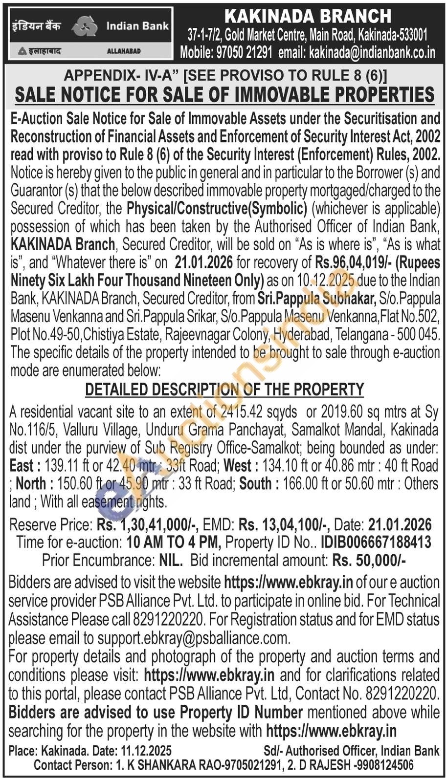 A residential vacant site to an extent of 2415.42 sqyds or 2019.60 sq mtrs at Sy No.116/5, Valluru Village, Unduru Grama Panchayat, Samalkot Mandal, Kakinada dist under the purview of Sub Registry Office-Samalkot; being bounded as under: East: 139.11 ft or 42.40 mtr: 33ft Road; West: 134.10 ft or 40.86 mtr: 40 ft Road North: 150.60 ft or 45.90 mtr: 33 ft Road; South: 166.00 ft or 50.60 mtr: Others land; With all easement rights.