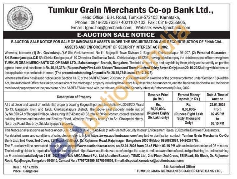 All that piece and parcel of residential property bearing Bagepalli purasabha khatha No.3068/2D, Ward No.13, Bagepalli Town and Taluk, Chikkaballapura District. The above said property made out of Sy No.550:2A of Bagepalli village. Measuring 115 42 and 40*33 total 6150 feet construction of residential building thereon and bounded on: East by: Road, West by: Property belong's to Sri. Chalapathi shetty, North by: Road, South by: Sri. Muniyappa's property.