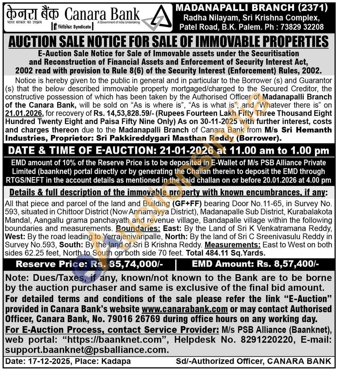 All that piece and parcel of the land and Building (GF+FF) bearing Door No.11-65, in Survey No. 593, situated in Chittoor District (Now Annamayya District), Madanapalle Sub District, Kurabalakota Mandal, Aangallu grama panchayath and revenue village, Bandapalle village within the following boundaries and measurements. Boundaries: East: By the Land of Sri K Venkatramana Reddy, West: By the road leading to Yerrajenivaripalle, North: By the land of Sri C Sreenivasulu Reddy in Survey No.593, South: By the land of Sri B Krishna Reddy. Measurements: East to West on both sides 62.25 feet, North to South on both side 70 feet. Total 484.11 Sq. Yards.