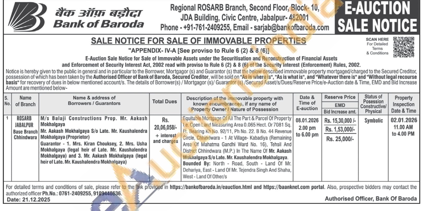contact the authorized officer Ph.No.: 0761-2409255, 9109440636.