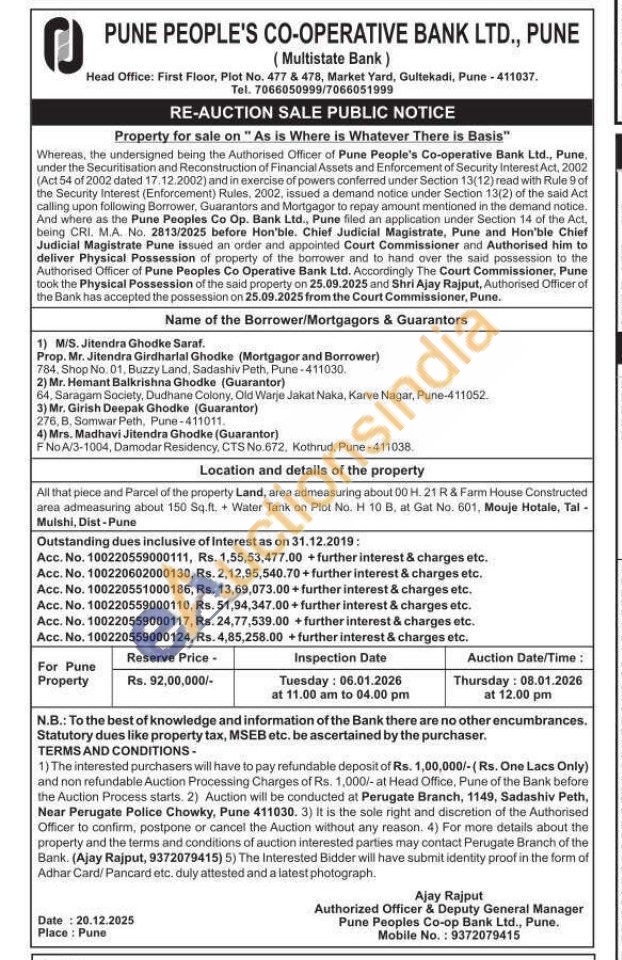 All that piece and Parcel of the property Land, area admeasuring about 00 H. 21 R & Farm House Constructed area admeasuring about 150 Sq.ft. + Water Tank on Plot No. H 10 B. at Gat No. 601, Mouje Hotale, Tal-Mulshi, Dist-Pune