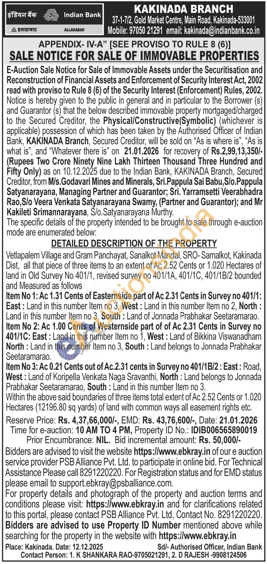 Vetlapalem Village and Gram Panchayat, Sanalkot Mandal, SRO- Samalkot, Kakinada Dist, all that piece of three items to an extent of Ac 2.52 Cents or 1.020 Hectares of land in Old Survey No 401/1, revised survey no 401/1A, 401/1C, 401/1B/2 bounded and Measured as follows Item No 1: Ac 1.31 Cents of Easternside part of Ac 2.31 Cents in Survey no 401/1: East: Land in this number Item no 3, West: Land in this number Item no 2, North: Land in this number Item no 3, South: Land of Jonnada Prabhakar Seetaramarao. Item No 2: Ac 1.00 Cents of Westernside part of of Ac 2.31 Cents in Survey no 401/1C: East: Land in this number Item no 1, West: Land of Bikkina Viswanadham North: Land in this number Item no 3, South: Land belongs to Jonnada Prabhakar Seetaramarao. Item No 3: Ac 0.21 Cents out of Ac.2.31 cents in Survey no 401/1B/2: East: Road, West: Land of Koripella Venkata Naga Sravanthi, North: Land belongs to Jonnada Prabhakar Seetaramarao, South: Land in this number Item no 3. Within the above said boundaries of three items total extent of Ac 2.52 Cents or 1.020 Hectares (12196.80 sq yards) of land with common ways all easement