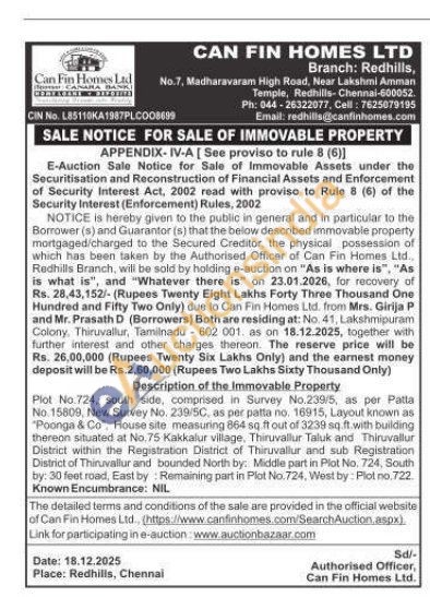 Plot No.724, south side, comprised in Survey No.239/5, as per Patta No. 15809, New Survey No. 239/5C, as per patta no. 16915, Layout known as "Poonga & Co, House site measuring 864 sq. ft out of 3239 sq.ft with building thereon situated at No. 75 Kakkalur village, Thiruvallur Taluk and Thiruvallur District within the Registration District of Thiruvallur and sub Registration District of Thinuvallur and bounded North by: Middle part in Plot No. 724, South by: 30 feet road, East by: Remaining part in Plot No. 724, West by: Plot no. 722.