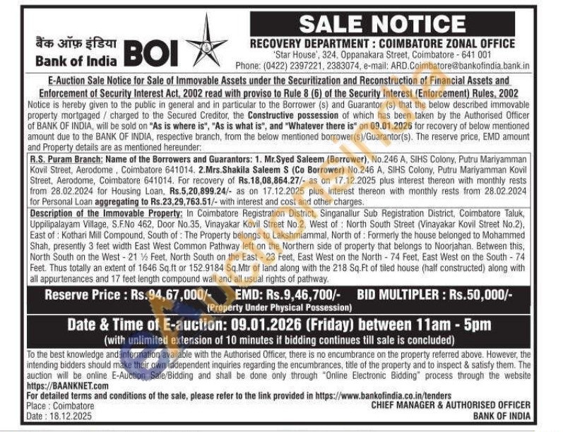 In Coimbatore Registration District, Singanallur Sub Registration District, Coimbatore Taluk, Uppilipalayam Village, S.F.No 462, Door No.35, Vinayakar Kovil Street No.2, West of North South Street (Vinayakar Kovil Street No.2), East of: Kothari Mill Compound, South of: The Property belongs to Lakshmiammal, North of Formerly the house belonged to Mohammed Shah, presently 3 feet width East West Common Pathway left on the Northern side of property that belongs to Noorjahan. Between this, North South on the West-21% Feet, North South on the East-23 Feet, East West on the North-74 Feet, East West on the South - 74 Feet. Thus totally an extent of 1646 Sq.ft or 152.9184 Sq.Mtr of land along with the 218 Sq. Ft of tiled house (half constructed) along with all appurtenances and 17 feet length compound wall and all usual rights of pathway.