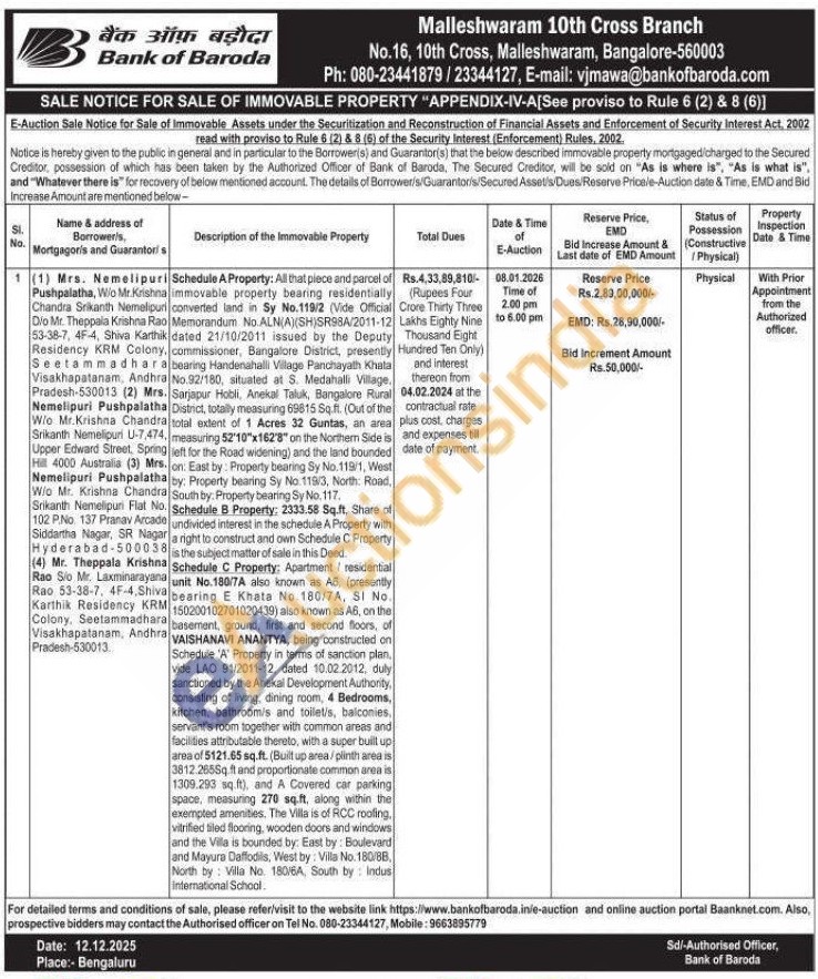 Schedule A Property: All that piece and parcel of immovable property bearing residentially converted land in Sy No.119/2 (Vide Official Memorandum No.ALN(A)(SH)SR98A/2011-12 dated 21/10/2011 issued by the Deputy commissioner, Bangalore District, presently bearing Handenahalli Village Panchayath Khata No.92/180, situated at S. Medahalli Village. Sarjapur Hobli, Anekal Taluk, Bangalore Rural District, totally measuring 69815 Sq.ft. (Out of the total extent of 1 Acres 32 Guntas, an area . measuring 52'10"x162'8" on the Northern Side is left for the Road widening) and the land bounded on: East by: Property bearing Sy No. 119/1, West by: Property bearing Sy No.119/3, North: Road, South by: Property bearing Sy No. 117. Schedule B Property: 2333.58 Sq.ft, Share of undivided interest in the schedule A Property with a right to construct and own Schedule C Property is the subject matter of sale in this Deed. Schedule C Property: Apartment / residential unit No.180/7A also known as A6, (presently bearing E Khata No. 180/7A, SI No. 150200102701020439) also known as A6, on the basement, ground, first and second floors, of VAISHANAVI ANANTYA, being constructed on Schedule 'A' Property in terms of sanction plan, vide LAO 91/2011-12, dated 10.02.2012, duly sanctioned by the Anekal Development Authority, consisting of living, dining room, 4 Bedrooms, kitchen, bathroomis and toilet/s, balconies, servant's room together with common areas and facilities attributable thereto, with a super built up area of 5121.65 sq.ft. (Built up area/plinth area is 3812.2655q.ft and proportionate common area is 1309.293 sq ft), and A Covered car parking space, measuring 270 sq.ft, along within the exempted amenities. The Villa is of RCC roofing, vitrified tiled flooring, wooden doors and windows and the Villa is bounded by: East by: Boulevard and Mayura Daffodils, West by: Villa No. 180/88, North by: Villa No. 180/6A, South by Indus International School