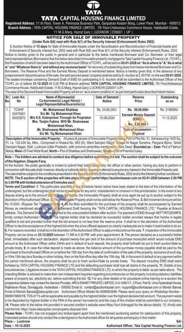 Description of the Immovable Property: All piece & parcels of Immovable Property being Part of Plot No. 51, Admeasuring 1425 Sq Ft. ie. 132.434 Sq. Mtrs, Comprised in Khasra No. 683 (S), Ward Sarojani Nagar, Village Ali Nagar Sunehra, Pargana Bijnor, Tehsil Sarojani Nagar, Distt. Lucknow (Uttar Pradesh), with common amenities mentioned in Sale Deed. Bounded as: East-Plot of Fakhun Nisha, West-25 Feet Wide Road, North-Plot of Shahbaz and Shahnawaz, South-Plot of Premila Dubey