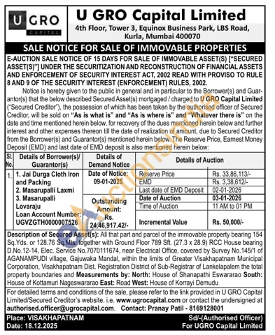 Description of Secured Asset(s): All that part and parcel of the immovable property bearing 154 Sq. Yds. or 128.76 Sq.Mts. together with Ground Floor 789 Sft. (27.3 x 28.9) RCC House bearing D.No.12-14, Elec. Service No. 7070111674, near Electrical Office, covered by Survey No. 145/1 of AGANAMPUDI village, Gajuwaka Mandal, within the limits of Greater Visakhapatnam Municipal Corporation, Visakhapatnam Dist. Registration District of Sub-Registrar of Lankelapalem the total property boundaries and Measurements by: North: House of Shanapathi Eswararao South: House of Kottamuri Nageswararao East: Road West: House of Korrayi Demudu