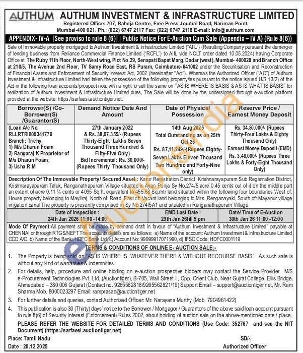 Karur Registration District, Krishnarayapuram Sub Registration District, Description Of The Immovable Property/Secured Asset: Karur Krishnarayapuram Taluk, Ranganathapuram Village situated in Ayan Punja Sy No.274/5 acre 0.45 cents out of it on the middle part an extent of acre 0.11% cents or 4095 Sq.ft. equivalent to 455.68 Sq.mtr land situated within the following four boundaries West of: House property belonging to Mayilraj, North of: Road, East of: Vacant land belonging to Mrs. Renganayaki, South of: Mayanur village irrigation canal. The property is presently comprised in Sy No.274/5A1 and situated in Renganathapuram Village