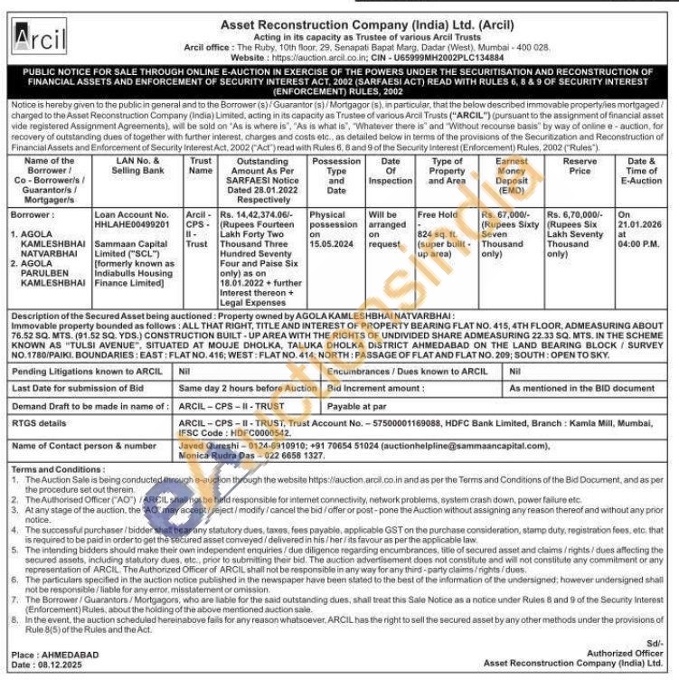 ALL THAT RIGHT, TITLE AND INTEREST OF PROPERTY BEARING FLAT NO. 415, 4TH FLOOR, ADMEASURING ABOUT 76.52 SQ. MTS. (91.52 SQ. YDS.) CONSTRUCTION BUILT-UP AREA WITH THE RIGHTS OF UNDIVIDED SHARE ADMEASURING 22.33 SQ. MTS. IN THE SCHEME KNOWN AS "TULSI AVENUE", SITUATED AT MOUJE DHOLKA, TALUKA DHOLKA DISTRICT AHMEDABAD ON THE LAND BEARING BLOCK / SURVEY NO.1780/ΡΑΙΚΙ. BOUNDARIES: EAST: FLAT NO.416; WEST: FLAT NO. 414; NORTH: PASSAGE OF FLAT AND FLAT NO. 209; SOUTH: OPEN TO SKY.