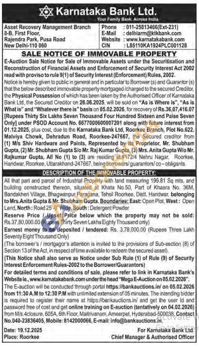 All that part and parcel of Industrial Property with land measuring 199.81 Sq mts, and building constructed thereon, situated at Khata No.50, Part of Khasra No. 36M, Bandakheri Village, Bhagwanpur Paragana, Tehsil Roorkee, Distt. Haridwar, belonging to Mrs. Anita Gupta & Mr. Shubham Gupta. Boundaries: East: Open Plot, West: Open Land, North: Road 25'-0" Wide, South: Detergent Powder
