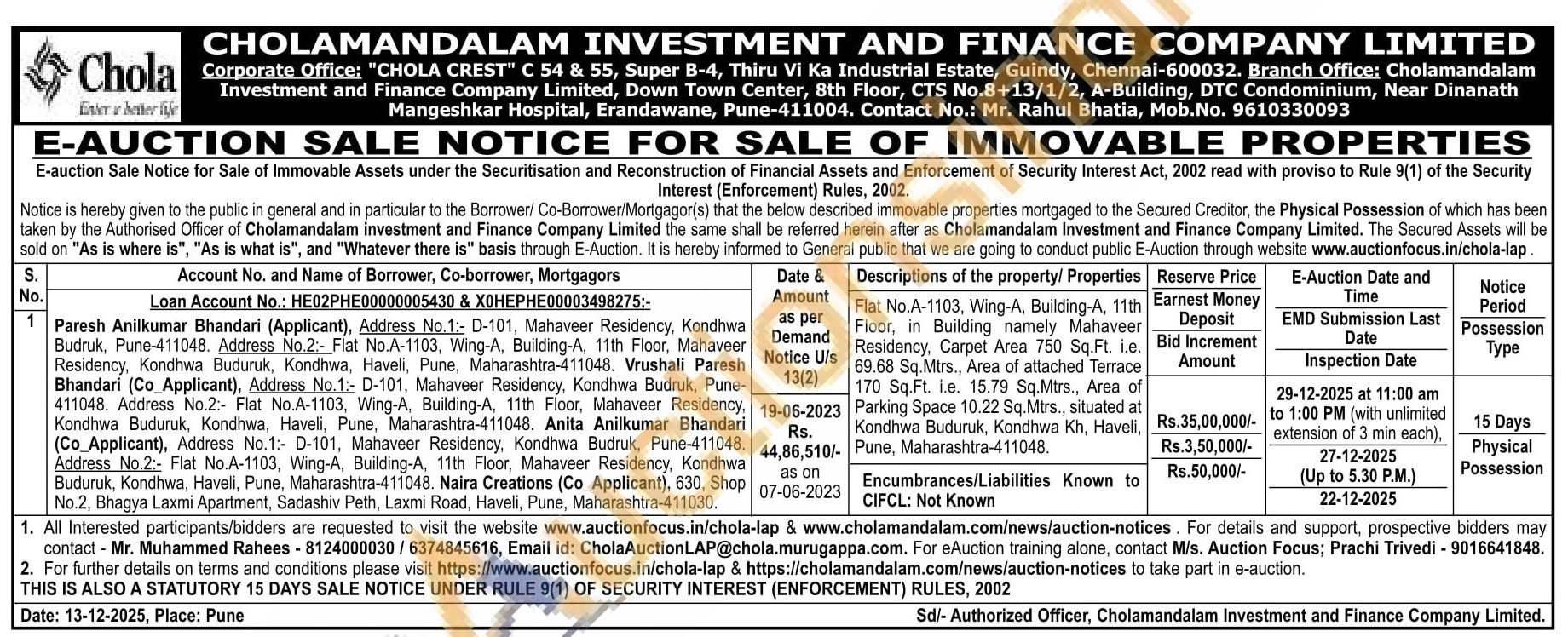 Flat No.A-1103, Wing-A, Building-A, 11th Floor, in Building namely Mahaveer Residency, Carpet Area 750 Sq.Ft. i.e. 69.68 Sq.Mtrs., Area of attached Terrace 170 Sq.Ft. i.e. 15.79 Sq.Mtrs., Area of Parking Space 10.22 Sq.Mtrs., situated at Kondhwa Buduruk, Kondhwa Kh, Haveli, Pune, Maharashtra-411048.