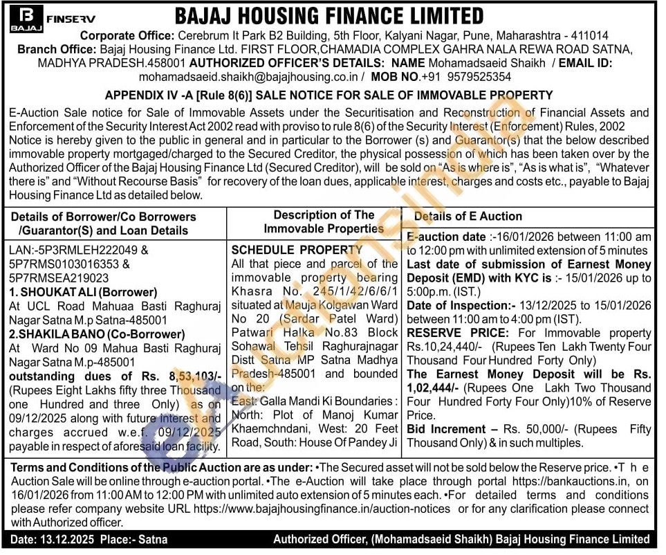 All that piece and parcel of the immovable property bearing Khasra No. 245/1/42/6/6/1 situated at Mauja Kolgawan Ward No 20 (Sardar Patel Ward) Patwari Halka No.83 Block Sohawal Tehsil Raghurajnagar Distt Satna MP Satna Madhya Pradesh-485001 and bounded on the:East: Galla Mandi Ki Boundaries: North: Plot of Manoj Kumar Khaemchndani, West: 20 Feet Road, South: House Of Pandey Ji