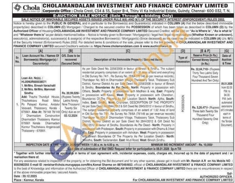 As per Sale Deed No. 2258/2008 in favour of Binesh & Sindhu, The subject residential property comprises of an extent of 1.31 Ares of land and everything Old Survey No. 74/1, Re Survey No. 78/6A (78/148 as per revenue records), Thandaper No. 923 in Dharmadam Village. Thalassery Taluk, Thalassery Sub District, Kannur District As per Sale Deed No 2258/2008 in favour of Binesh & Sindhu Boundaries As Per Deed: North: Property in possession with Others, South: Property in possession with Madhavi & way, East: Property in possession with Kausu, West: Property in possession with Chandran Boundaries Of The Property As Per Location Sketch: North: Ajitha, South: Indira, East: Sindhu, West: Chandran, DESCRIPTION OF THE PROPERTY As per Sale Deed No 2844/2012 & Gift Deed No 2845/2012 in favour of Sindhu, The subject residential property comprises of an extent of 1.92 Ares of land in Old Survey No 74/1, Re Survey No 78/6A (78/149 as per revenue records) Thandaper No 924 in Dharmadam Vilage. Thalassery Taluk, Thalassery Sub District, Kannur District as per Sale Deed No 2844/2012 & Gift Deed No 2845/2012 in favour of Sindhu. Boundaries As Per Deed-North: Property in possession with Pradeepan, South: Property in possession with Dhamu & 3 feet way. East: Property in possession with Ashokan, West: Property in possession with Binesh Boundaries Of The Property As Per Location Sketch: North: Yesodha, South: Sadanandan, East: Mud Road, West: Binesh Sindhu