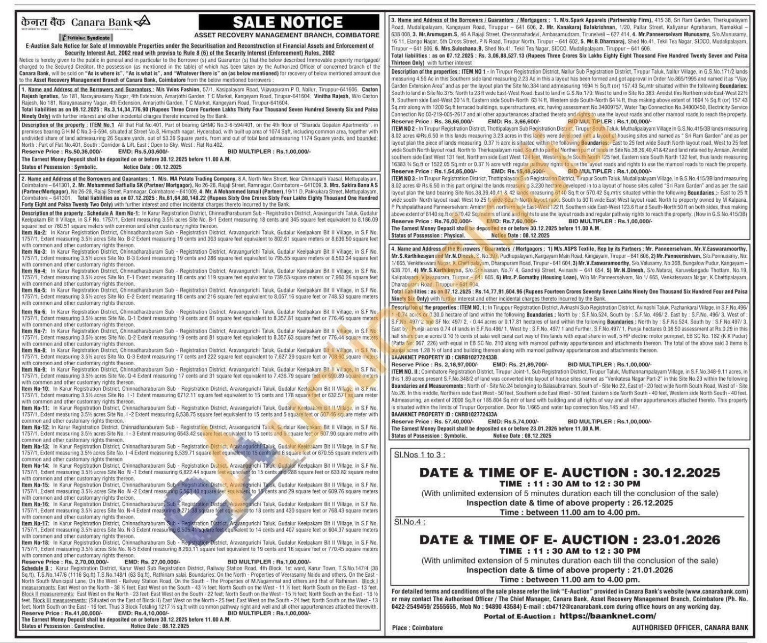 Description of the property: ITEM No.1 All that Flat No.401, Part of bearing GHMC No.3-6-594/401, on the 4th floor of "Sharada Gopalan Apartments", in premises bearing GH MC No.3-6-594, situated at Street No.8, Himyath nagar, Hyderabad, with built up area of 1074 Sqft, including common area, together with undivided share of land admeasuring 26 Square yards, out of 53.36 Square yards, from and out of total land admeasuring 1174 Square yards, and bounded: North: Part of Flat No.401, South: Corridor & Lift, East: Open to Sky, West: Flat No.402.