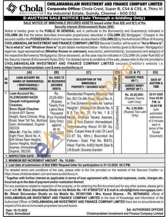 Residential Property Bearing Flat No. 801 On 8th Floor, Block No. A, In The Scheme Known As "samor Heights", Situated On Block No. 5 & 6 Tps No. 70. Fp No. 1 & 2 Mouje: Muthiya Taluka: Asarwa, Dist. & Sub District: Ahmedabad. (Admeasuring About 61.88 Sq. Mtrs. Carpet Area & Uds Of Land 23.97 Sq. Mtrs.) Bounded As Follows:- East: Flat No. B/810, West: Flat No. A/802 North Stair & Lift South: Society Garden