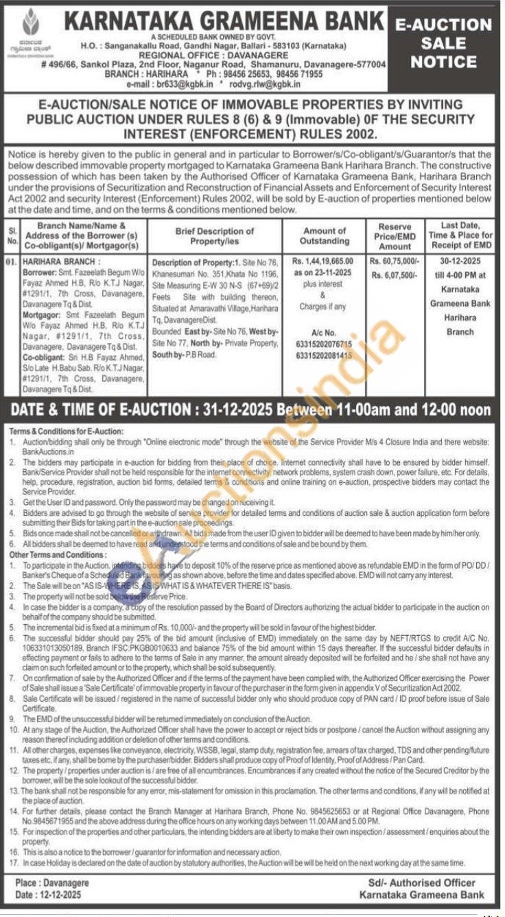 Description of Property: 1. Site No 76. Khanesumari No. 351, Khata No 1196, Site Measuring E-W 30 N-S (67+69)/2 Feets Site with building thereon, Situated at Amaravathi Village, Harihara Tq. Davanagere Dist Bounded East by-Site No 76, West by-Site No 77, North by- Private Property, South by-P.B Road