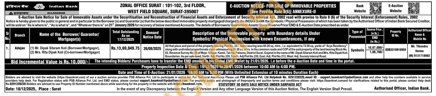All that piece and parcel of the property bearing Plot No. 227, Admeasuring area 60.28 sq. mtrs., i.e. equivalent to 72.00 sq. yards of "Arya Residency" along with undivided proportionate share admeasuring 35.26 sq. mtrs. In the common roads and COP of the said property of the land bearing Block No. 82, Revenue Survey No. 55 of Moje: Village: Kareli, Taluka, Palsana, District Surat, Gujarat in the name of Mr. Dipak Sitaram Koli and Mrs. Rita Dipak Koli.