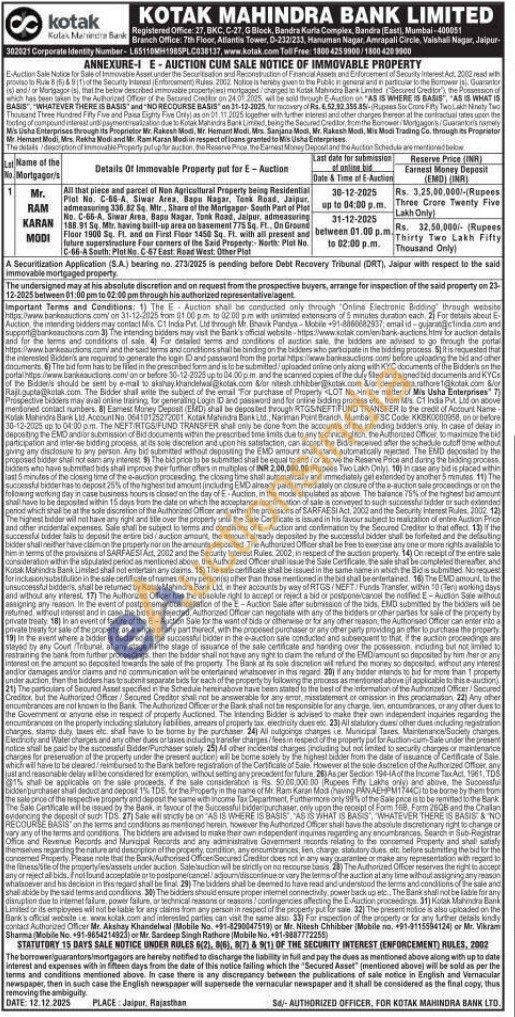 All that piece and parcel of Non Agricultural Property being Residential Plot No. C-66-A, Siwar Arez, Bapu Nagar, Took Road, Jaipur, admeasuring 336. 82 Se Mir Share of the Mortgagor South Part of Pist No. C-66-A, Siwar Area, Bapu Nagar, Tonk Road, Jaipur, admeasering 188 41 M Sowar Area, Bapu Nagar, Tonk Road, Jaipur, admeasering Floor 1900 So. Pl. and on First Floor 1450 Sq. Fl. with all present andfuture superstructure Four corners of the Said Property: North: Plat No. C-66-A South: Plot No. C-67 East: Road West: Other Plot