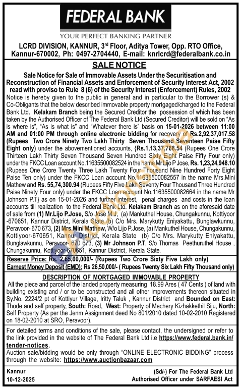 All the piece and parcel of the landed property measuring 18.99 Ares (47 Cents) of land with building existing and/or to be constructed and all other improvements thereon situated in Sy.No. 2224/2 pt of Kottiyur Village, Iritty Taluk, Kannur District and Bounded on East: Thode and self property, South: Road, West: Property of Mechery Kizhakkethil Siju, North: Self Property (As per the Jenm Assignment deed No 801/2010 dated 10-02-2010 Registered on 18-02-2010 at SRO, Peravoor).