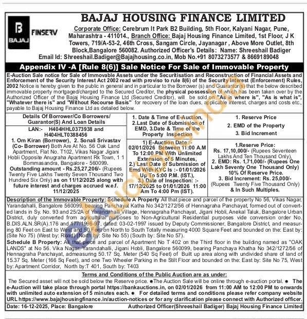 Schedule B Property: All that piece and parcel of Apartment No T 402 on the Third floor in the building named as "OAK LANDS at No 56. Vika Nagar. Yarandahalli, Jigani Hobli, Bangalore 560099, bearing Panchaya Khatha No 342/1272/56 of Hennagraha Panchayat, admeasuring 50.17 Sq. Meter (540 Sq Feet) of Built up area along with undivided share of land of 15.37 Sq. Meter (166 Sq Feet), and one Two Wheeler Parking in the Stilt Floor and bounded on the: East by: Site No 75, West by: Apartment Corridor, North by:T 401, South by: T403