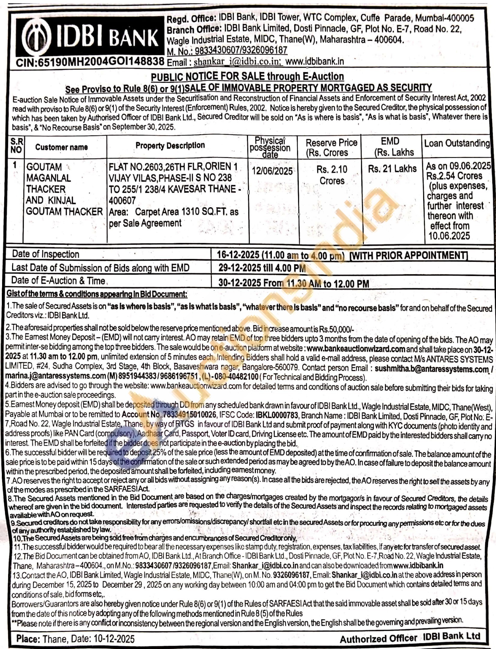 FLAT NO.2603,26TH FLR, ORIEN 1 VIJAY VILAS, PHASE-II S NO 238 ΤΟ 255/1 238/4 KAVESAR THANE -400607Area: Carpet Area 1310 SQ.FT. as per Sale Agreement