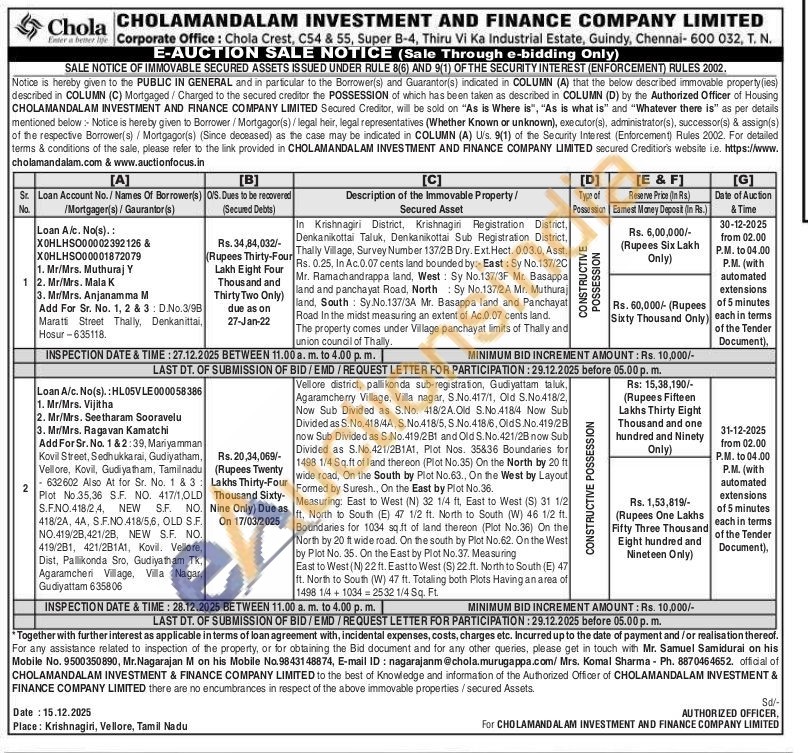 Vellore district, pallikonda sub-registration, Gudiyattam taluk, Agaramcherry Village, Villa nagar. S.No.417/1, Old S.No.418/2, Now Sub Divided as S.No. 418/2A.Old S.No.418/4 Now Sub Divided as S.No.418/4A, S.No.418/5, S.No.418/6, OldS.No.419/2B now Sub Divided as S.No.419/2B1 and Old S.No.421/2B now Sub Divided as S.No.421/2B1A1, Plot Nos. 35836 Boundaries for 1498 1/4 Sq.ft of land thereon (Plot No.35) On the North by 20 ft wide road, On the South by Plot No.63., On the West by Layout Formed by Suresh., On the East by Plot No.36. Measuring: East to West (N) 32 1/4 ft, East to West (S) 31 1/2 ft, North to South (E) 47 1/2 ft. North to South (W) 46. 1/2 ft. Boundaries for 1034 sq.ft of land thereon (Plot No.36) On the North by 20 ft wide road. On the south by Plot No.62. On the West by Plot No. 35. On the East by Plot No.37. Measuring East to West (N) 22 ft. Eastto West (S) 22.ft. North to South (E) 47 ft. North to South (W) 47 ft. Totaling both Plots Having an area of 1498 1/4+1034= 2532 1/4 Sq. Ft