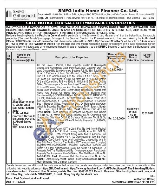 All That Piece Or Parcel Of The Property Situated In Hukumpeta Village, And Hukumpeta Gram Panchayat, East Godavari Dist, The Land Covered By Zeroity Meraka Beating R.S.No 45/1 Total Extent Of Ac 3.15 Cents Of Land Sub-Divided, In Which Southern Side Part Of Land Admeasuring For An Extent Of Ac. 1.52 1½ Cents Of Land Or Equivalent To 7381 Sq Yards Or 6171.46 Sq Meters Of Land Comes Into R.S No 45/1b In Which 615 Sq Yards Of Site Gifted To Hukumpeta Gram Panchayat Towards Master Plan 40 Ft Road Widening Purpose, And The Remaining Site Site Of 6766 Sq Yards Land Proposed And Constructing Residential Apartments Name And Styled As "Royal Town" And The Building Plan Sanctioned By GODAVARI URBAN DEVELOPMENT AUTHORITY (GUDA) Kakinada Vide B.P. No 09/2018/Guda Dated 22.03.2018 And The Schedule A Property Within The Jurisdiction Of Kadiyam Sub-Register Office, Registration Dist. Of Rajamahandravaram Which Is Bounded By: East: Land Belongs To P.Suresh, South :NS Raju Layout House Sites, West Master Plan 40 Feet Road, North: Land Belongs To Boppana Mangatayi and Others In S.No 45/1a, Within The Above Boundaries An Undivided And Unspecified Site Area Of 35.36 Sq Yards Equivalent To 29.56 Sq Mts. Out Of Total Site Area Of A-Schedule Property I.E., 6766 Sq Yards Or 5657 46 Sq Mts