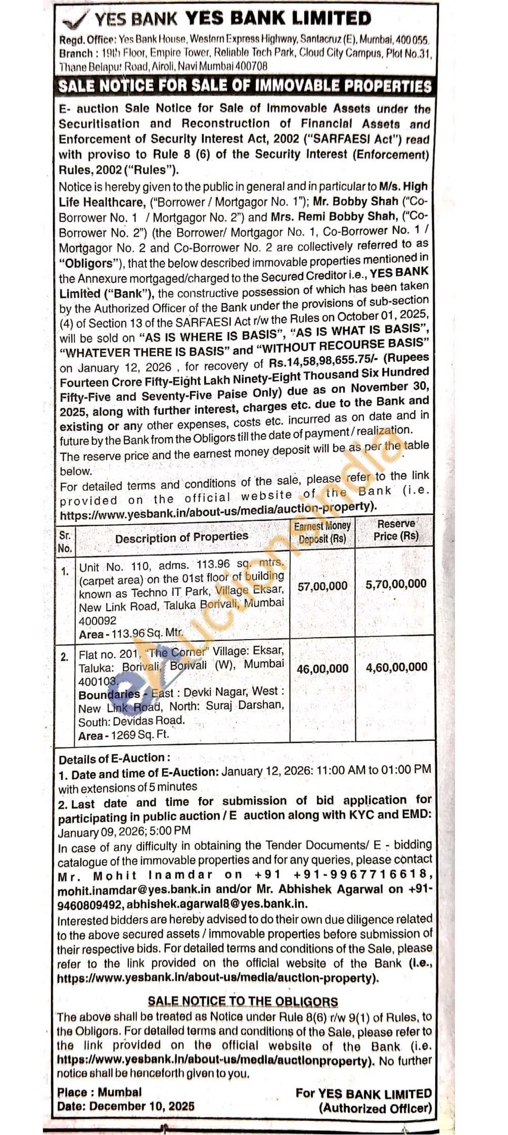 Flat no. 201, "The Corner Village: Eksar, Taluka: Borivali, Borivali (W), Mumbai 400103. Boundaries East: Devki Nagar, West: New Link Road, North: Suraj Darshan, South: Devidas Road. Area-1269 Sq. Ft.