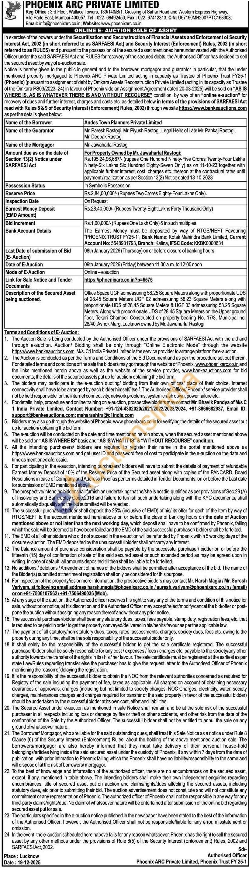 Office Space UGF admeasuring 58.25 Square Meters along with proportionate UDS of 28.45 Square Meters UGF 02 admeasuring 58.23 Square Meters along with proportionate UDS of 28.45 Square Meters & UGF 03 admeasuring 58.25 Square Meters. Along with proportionate UDS of 28.45 Square Meters on the Upper ground floor, Tekari Chamber Constructed on property bearing No. 17/3, Municipal no. 28/40, Ashok Marg, Lucknow owned by Mr. Jawaharlal Rastogi