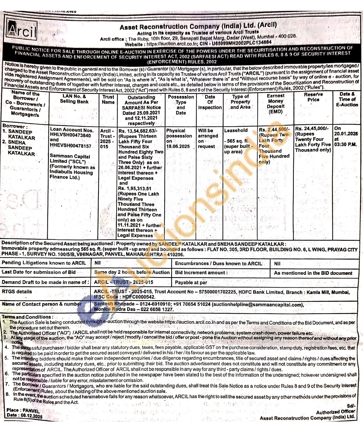 Description of the Secured Asset being auctioned: Property owned by SANDEEP KATALKAR and SNEHA SANDEEP KATALKAR: Immovable property admeasuring 565 sq. ft. (super built-up area) and bounded as follows: FLAT NO. 305, 3RD FLOOR, BUILDING NO. 6, L WING, PRAYAG CITY PHASE-1, SURVEY NO. 100/5/B, VIHINAGAR, PANVEL, MAHARASHTRA-410206