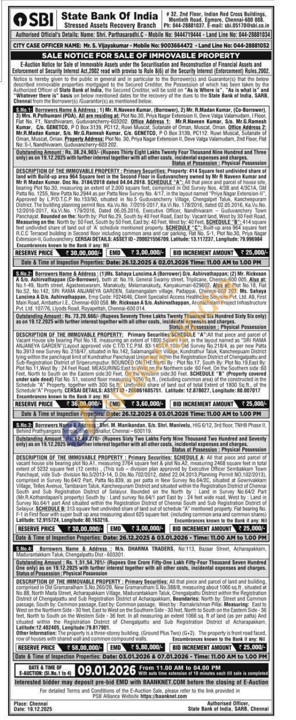 1): All that piece and parcel of house site, bearing Plot No.30, measuring an extent of 2,000 square feet, comprised in Old Survey Nos. 4/38 and 4/3C1A, Old Patta No. 1255, New Patta No.2944 as per Patta New Survey No. 4/17, in the layout named "Priya Nagar Extension-II", Approved by L.P/D.T.C.P No. 153/90, situated in No.5 Guduvancherry Village, Chengalpet Taluk, Kancheepuram District. The building planning permit Nos. Ka.Vu.No. 7/2016-2017, Ka.Vi.No. 178/2016, dated 02.05.2016, Ka. Vu.No. 12/2016-2017, Ka.VI.No. 179/2016, Dated 06.05.2016, Executive Officer, Nandhivaram Guduvanchery Town Panchayat. Bounded on the: North by: Plot No.29, South by 40 Feet Road, East by: Vacant land, West by 30 Feet Road, Measuring on the: North by: 50 Feet, South by 50 Feet, East by: 40 Feet, West by: 40 Feet, SCHEDULE "B": 414 square feet undivided share of land out of 'A' schedule mentioned property. SCHEDULE "C": Built-up area 964 square feet R.C.C Terraced building in Second floor including common area and car parking, Flat No. S-1, Plot No.30, Priya Nagar Extension-II, Guduvanchery, CERSAI DETAILS: ASSET ID-200021556709. Latitude: 13.117237, Longitude: 79.996984 Encumbrances known to the Bank if any: Nil