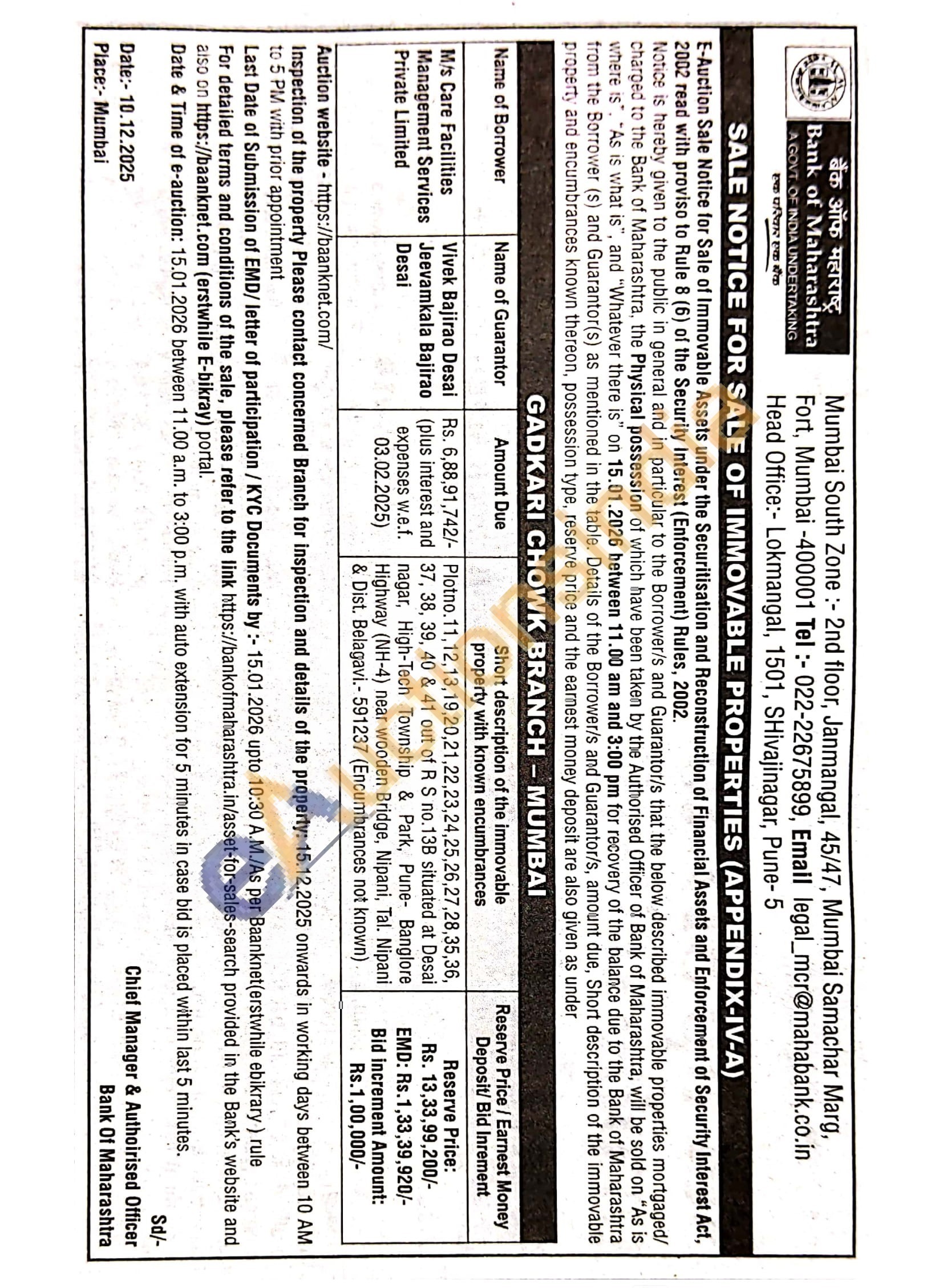 Plot no.11,12,13,19,20,21,22,23,24,25,26,27,28,35,36, 37, 38, 39, 40 & 41 out of R S no.13B situated at Desai nagar, High-Tech Township & Park, Pune Banglore Highway (NH-4) near wooden Bridge, Nipani, Tal. Nipani & Dist. Belagavi.- 591237 (Encumbrances not known)