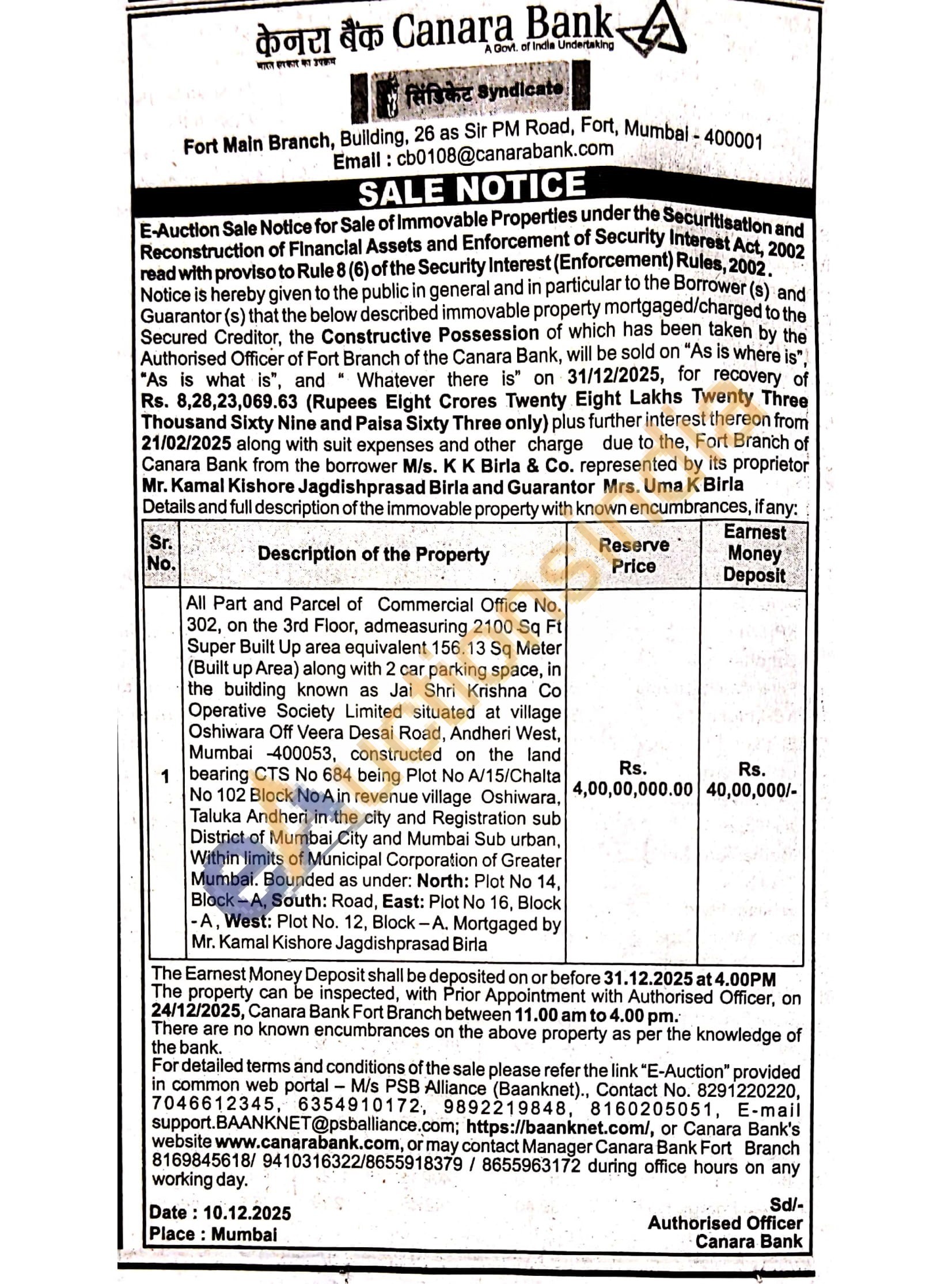All Part and Parcel of Commercial Office No. 302, on the 3rd Floor, admeasuring 2100 Sq Ft Super Built Up area equivalent 156.13 Sq Meter (Built up Area) along with 2 car parking space, in the building known as Jai Shri Krishna Co Operative Society Limited situated at village Oshiwara Off Veera Desai Road, Andheri West, Mumbai -400053, constructed on the land bearing CTS No 684 being Plot No A/15/Chalta No 102 Block No A in revenue village Oshiwara, Taluka Andheri in the city and Registration sub District of Mumbai City and Mumbai Sub urban, Within limits of Municipal Corporation of Greater Mumbai. Bounded as under: North: Plot No 14, Block-A, South: Road, East: Plot No 16, Block -A, West: Plot No. 12, Block-A. Mortgaged by Mr. Kamal Kishore Jagdishprasad Birla
