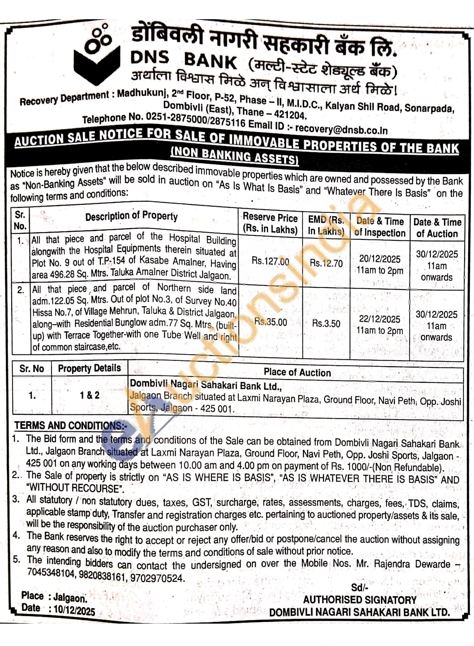 All that piece and parcel of Northern side land adm. 122.05 Sq. Mtrs. Out of plot No.3, of Survey No.40 Hissa No.7, of Village Mehrun, Taluka & District Jalgaon, along with Residential Bunglow adm.77 Sq. Mtrs. (built-up) with Terrace Together-with one Tube Well and right of common staircase,etc.
