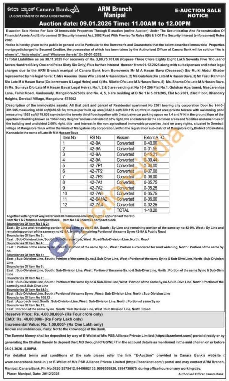 All that part and parcel of Residential apartment No 2301 bearing city corporation Door No 1-N-5-391/205, measuring 4850 sqfh(450.58 Sq mtrs)super built up area(3542.6 sqft (329.115 sq mirajin carpet area private terrace with swimming pool measuring 1925 sqft(178.836 sqmtrsjon the twenty third floor, together with 3 exclusive car parking space no 1,4 and V14 in the ground floor of the apartment building known as "Bhandary Heights and an undivided 2.33% right, title and interest in the common areas and facilities and amenities of the building and undivided 2.00% right, title and interest in the non agricultural immovable properties, held on warg rights, situated in Derebail village of Mangalore Taluk within the limits of Mangalore city corporation, within the registration sub-district of Mangalore City, District of Dakshina Kannada in the name of Lats Mr MA Hassan Bava Together with right of way, water and all mamul easementary rights appurtenant thersto Item No 1 & 2 forms a compact block, Item No 889 forms a compact block Boundaries Of Item No 1&2: 1-10.20 TOTAL East: Sy Line and remaining portion of the same sy no 42-9A, South: By Line and remaining portion of the same sy no 42-9A, West: Sy Line and remaining portion of the same sy no-42-34, North: Remaining Portion of the same Sy no 42-3A & Public Road Boundaries Of Item No 3: East: Sub-Division Line, South: Sub-Division Line, West: Road/Sub-Division Line, North: Road Boundaries Of itam No 4: East: Portion of the same Sy no, South Portion of the same Sy no, West: Portion surrendered for road widening, North: Portion of the same Sy Boundaries Of Item No 5: East: Sub-Division Line, South: Portion of the same Sy.no & Sub-Divn Line, West: Portion of the same Sy.no & Sub-Divn Line, North: Sub-Division Line Boundaries Of Item No 6: East: Sub-Division Line, South: Sub-Division Line, West: Portion of the same Sy.no & Sub-Divn Line, North: Portion of the same Sy.no & Sub-Divn Boundaries Of Item No 7: East: Sub-Division Line, South: Portion of the same Sy.no & Sub-Divn Line, West: Portion of the same Sy.no & Sub-Divn Line, North: Portion of the same Syno & Sub-Divn Line East: Sub-Division Line, South: Portion of the same Sy.no, West: Sub-Division Line, North: Sub-Division Line Boundaries Of Item No 889: East: Approach road, South: Sub-Division Line, West: Sub-Division Line, North: Portion of same Sy no Boundaries Of Item No 10812: East: Portion of the same Syno, South: Sub Division Line, West: Sub Division Line, North: Road
