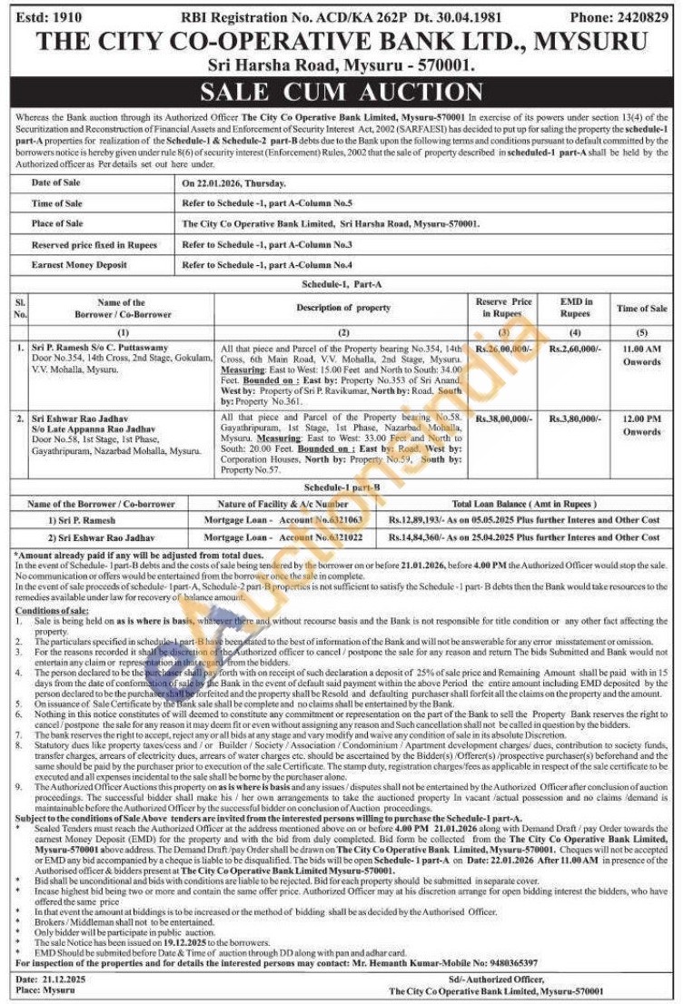 2) All that piece and Parcel of the Property bearing No.5% Gayathripuram, Ist Stage, Ist Phase, Nazarbad Mohalla, Mysuru. Measuring East to West: 13.00 Feet and North to South: 20:00 Feet. Bounded on: East by: Road, West by: Corporation Homes, North by: Property No.59, South by: Property No.57.