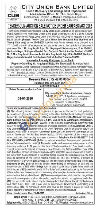 East Godavari District, Kothapeta Sub-Registration Office, Kothapeta Mandal, Kothapeta Vilage R.S No.452/1, in an Extent of 334.7 Sq. Yds. of Site with RCC Building therein Bearing D.No. 17-168/1 Bounded by: East Land of Chodapaneedi Lakshmikantam and others, South 18 Feet Wide Passage. West: Land of Chodapaneedi Lakshmikantam and others. North Road