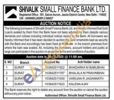 Shivalik Small Finance Bank Ltd Gold Auctions Auction in Surat