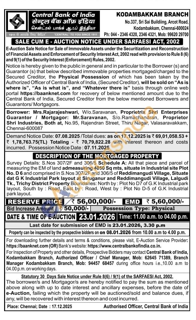 Authorized Officer / Chief Manager Mobile No : 6264571389 / Branch Manager Kodambakkam Branch Mobile No : 9445768457