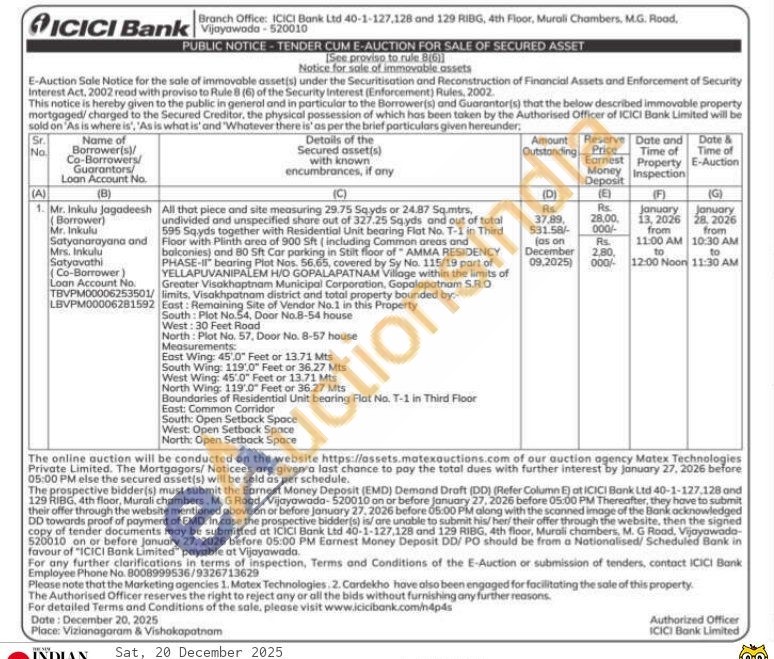 All that piece and site measuring 29.75 Sq yds or 24.87 Sq.mtrs, undivided and unspecified share out of 327.25 Sq.yds and out of total 95 Sqyds together with Residential Unit bearing Flat No. T-1 in Third Floor with Plinth area of 900 Sft (including Common areas and balconies) and 80 Sft Car parking in Stilt floor of AMMA RESIDENCY PHASE-II bearing Plot Nos. 56,65, covered by Sy No. 115/19 part of YELLAPUVANIPALEM HID GOPALAPATNAM Village within the limits of Greater Visakhaptnam Municipal Corporation, Gopalapatnam S.R.O / limits, Visakhpatnam district and total property bounded by:-South: Plot No.54, Door No.8-54 house West: 30 Feet Road East: Remaining Site of Vendor No.1 in this Property North: Plot No. 57, Door No. 8-57 house Measurements: East Wing: 45'0" Feet or 13.71 Mts South Wing: 1191.0" Feet or 36.27 Mts West Wing: 45.0" Feet or 13.71 Mts North Wing 119'0" Feet or 36.27 Mts Boundaries of Residential Unit bearing Flat No. T-1 in Third Floor South: Open Setback Space West: Open Setback Space North: Open Setback Space