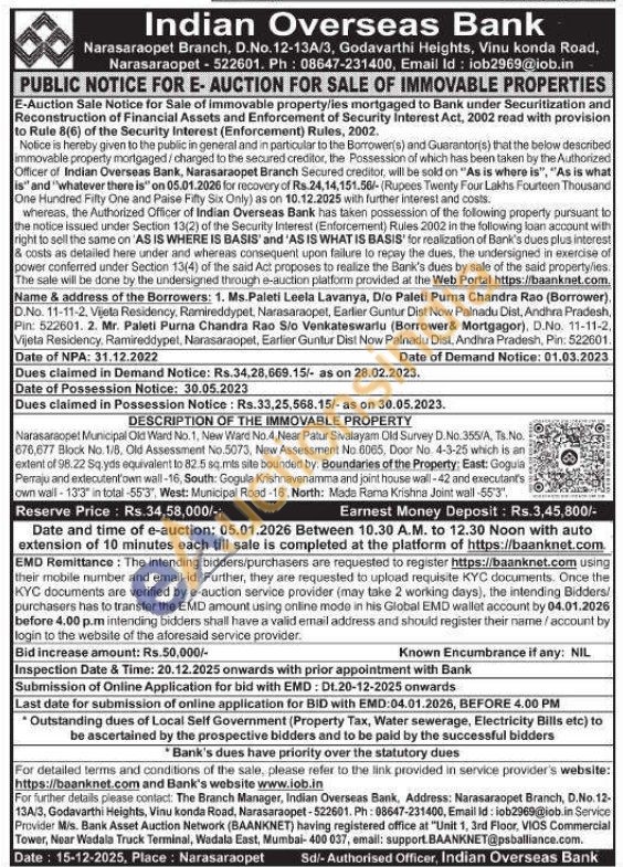 Narasaraope! Municipal Old Ward No. 1, New Ward No.4, Near Patur Sivalayam Old Survey D.No.355/A, Ts.No. 676,677 Block No. 1/8, Old Assessment No.5073, New Assessment No.6065, Door No. 4-3-25 which is an extent of 98.22 Sq.yds equivalent to 82.5 sq.mts site bounded by: Boundaries of the Property: East: Goguia Perraju and extecutent'own wall-16, South: Gogula Krishnavenamma and joint house wall-42 and executants own wall-13'3" in total -55'3", West: Municipal Road-16, North: Mada Rama Krishna Joint wall -55'3",