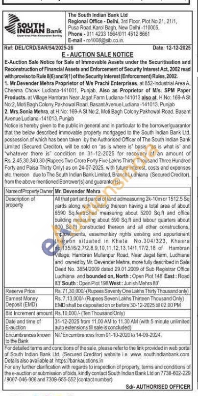 All that part and parcel of land admeasuring 2k-10m or 1512.5 Sq yards along with building thereon having a total area of about 6590 Sq.feet(Shed measuring about 5200 Sq.ft and office building measuring about 590 Sq.ft and labour quarters about 800 Sq.ft) constructed thereon and all other constructions, improvements, easementary rights existing and appurtenant thereon situated in Khata No.304/323, Khasra по: 135//6/2.7/2,8,9,10,11,12,13,14/1,17/2.18 of Hambran Village, Hambran Mullanpur Road, Near Jagat farm, Ludhiana and owned by Mr. Devender Mehra, more fully described in Sale Deed No. 3854/2009 dated 29.01.2009 of Sub Registrar Office Ludhiana and bounded on, North: Open Plot 146' East: Road 83 South: Open Plot 198 West: Junish Mehra 80'