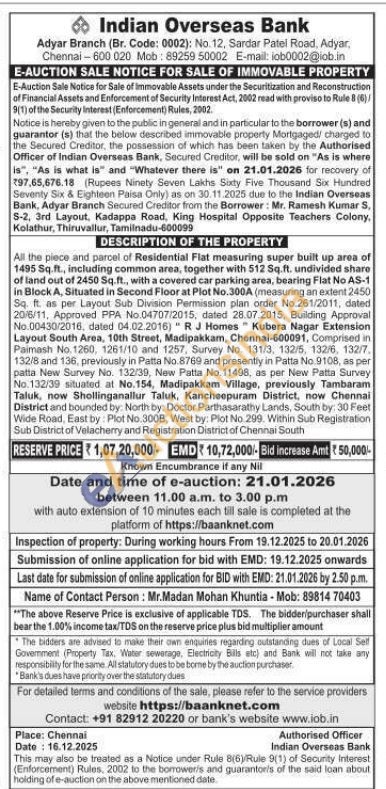 All the piece and parcel of Residential Flat measuring super built up area of 1495 Sq.ft., including common area, together with 512 Sq.ft. undivided share of land out of 2450 Sq.ft., with a covered car parking area, bearing Flat No AS-1 in Block A, Situated in Second Floor at Plot No.300A (measuring an extent 2450 Sq. ft. as per Layout Sub Division Permission plan order No.261/2011, dated 20/6/11, Approved PPA No.04707/2015, dated 28.07.2015, Building Approval No.00430/2016, dated 04.02.2016)" RJ Homes Kubera Nagar Extension Layout South Area, 10th Street, Madipakkam, Chennai-600091, Comprised in Paimash No. 1260, 1261/10 and 1257, Survey No. 131/3, 132/5, 132/6, 132/7, 132/8 and 136, previously in Patta No.8769 and presently in Patta No. 9108, as per patta New Survey No. 132/39, New Patta No.11498, as per New Patta Survey No. 132/39 situated at No.154, Madipakkam Village, previously Tambaram Taluk, now Shollinganallur Taluk, Kancheepuram District, now Chennai District and bounded by: North by: Doctor Parthasarathy Lands, South by: 30 Feet Wide Road, East by: Plot No. 300B, West by: Plot No.299. Within Sub Registration Sub District of Velacherry and Registration District of Chennai South
