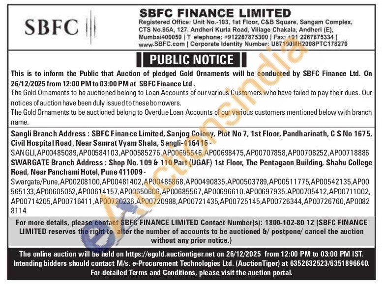 SBFC Finance Ltd Gold Auctions Auction in Mumbai