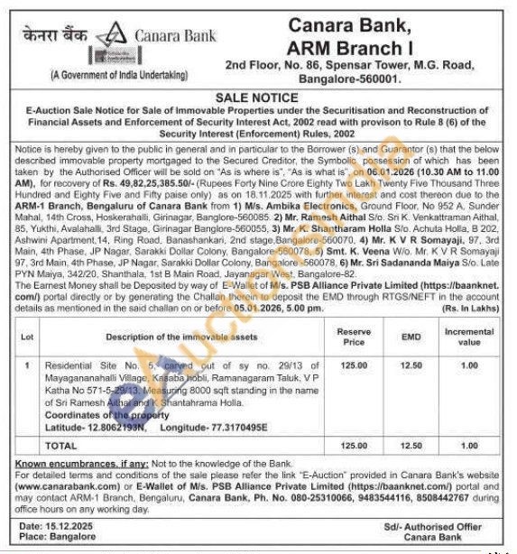 Residential Site No. 5. carved out of sy no. 29/13 of Mayagananahalli Village, Kasaba hobli, Ramanagaram Taluk. V P Katha No 571-5-29/13, Measuring 8000 sqft standing in the name of Sri Ramesh Aithal and K. Shantahrama Holia.