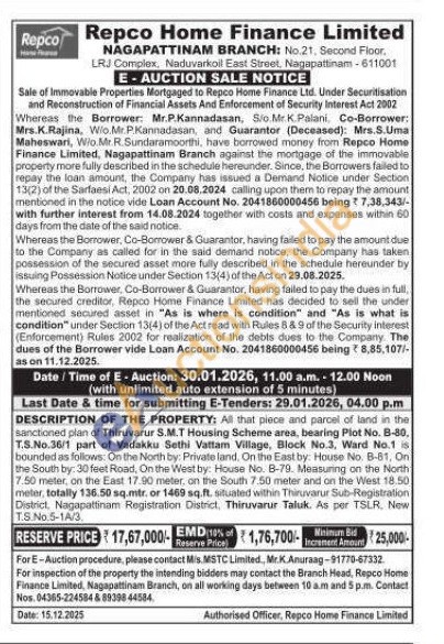 All that piece and parcel of land in the sanctioned plan of Thiruvarur S.M.T Housing Scheme area, bearing Plot No. B-80, T.S.No.36/1 part of Vadakku Sethi Vattam Village, Block No.3, Ward No.1 is bounded as follows: On the North by: Private land. On the East by: House No. B-81, On the South by: 30 feet Road, On the West by: House No. B-79. Measuring on the North 7.50 meter, on the East 17.90 meter, on the South 7.50 meter and on the West 18.50 meter, totally 136.50 sq.mtr. or 1469 sq.ft. situated within Thiruvarur Sub-Registration District, Nagapattinam Registration District, Thiruvarur Taluk. As per TSLR, New T.S. No.5-14/3