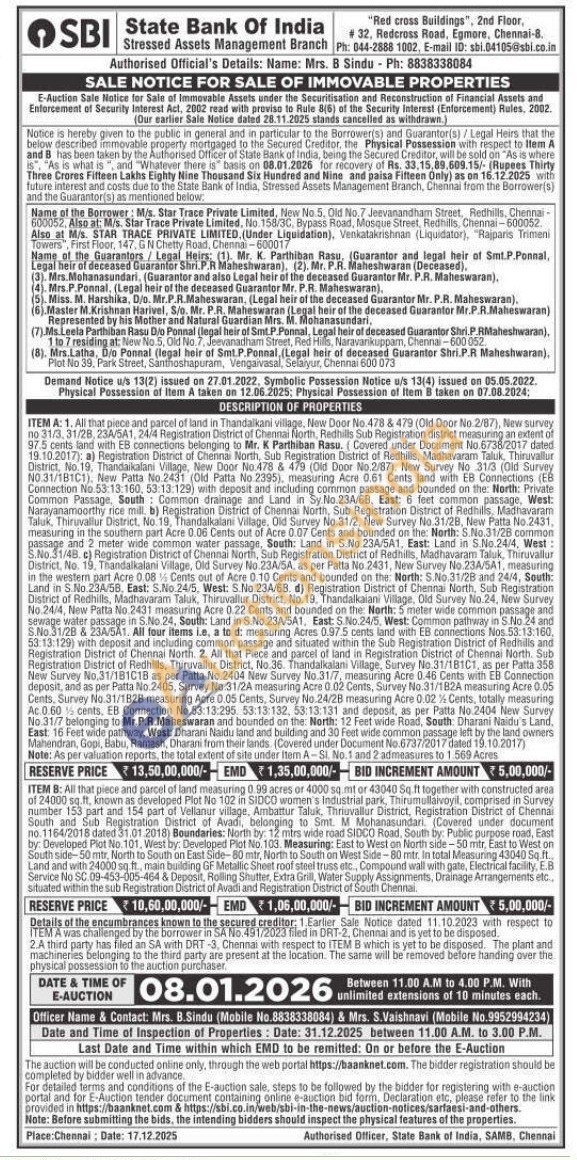 ITEM B: All that piece and parcel of land measuring 0.99 acres or 4000 sq.mt or 43040 Sq.ft together with constructed area of 24000 sq.ft, known as developed Plot No 102 in SIDCO women's Industrial park, Thirumollaivoyil, comprised in Survey number 153 part and 154 part of Vellanur village, Aribattur Taluk, Thriuvallur District, Registration District of Chennai South and Sub Registration District of Avadi, belonging to Smt. M. Mohanasundari (Covered under document no.1164/2018 dated 31.01.2018) Boundaries: North by: 12 mtrs wide road SIDCO Road, South by Public purpose road, East by Developed Plot No. 101. West by: Developed Plot No. 103. Measuring: East to West on North side-50 mtr, East to West on South side-50 mtr, North to South on East Side-80 mtr, North to South on West Side-B0 mtr. In total Measuring 43040 Sq.ft. Land and with 24000 sq ft, main building GF Metallic Sheet roof steel truss etc., Compound wall with gate, Electrical facility, E.B Service No SC 09-453-005-464 & Deposit, Rolling Shutter, Extra Grill, Water Supply Assignments, Drainage Arrangements etc. situated within the stub Registr District of Avadi and Registration District of South Chennai